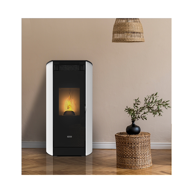 Le poêle à granulés étanche Meo 8kW de Foco se distingue par sa performance élevée tout en conservant un fonctionnement discret et efficace. Ce modèle, doté d’une puissance accrue, maintient les caractéristiques appréciées de la gamme Meo : un fonctionnement silencieux grâce à son moteur continu et une chambre de combustion avec brasier en fonte assurant une diffusion homogène et agréable de la chaleur. Sa vitre élancée offre une vue captivante sur les flammes, ajoutant une touche esthétique à votre espace de vie. La conception du Meo, avec une sortie concentrique sur le dessus, facilite son installation près des murs, optimisant l’espace disponible. La connectivité wifi en option et la télécommande thermostatique avec sonde déportée simplifient la gestion de la température, rendant l’utilisation quotidienne à la fois pratique et confortable. Parfait pour des espaces légèrement plus grands, le Meo 8 kW représente un choix idéal pour ceux qui recherchent un équilibre entre puissance, confort et design dans leur système de chauffage.